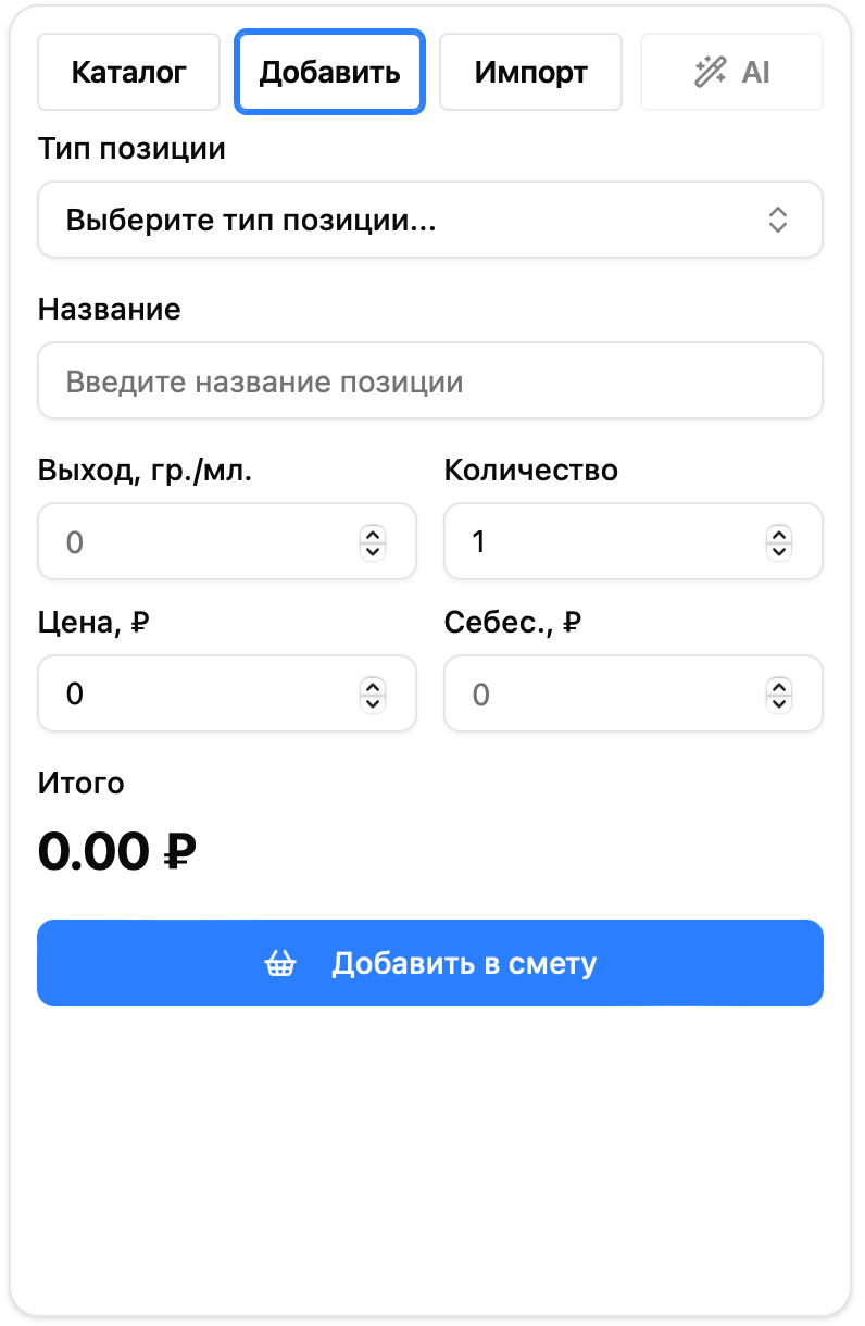 Добавление позиции вручную, без привязки к позиции из каталога - это подходит для добавления разовых позиций. В форме указывается название, выход, цена, количество, себестоимость. После нажатия на кнопку «Добавить в смету» позиция будет добавлена в текущую смету.