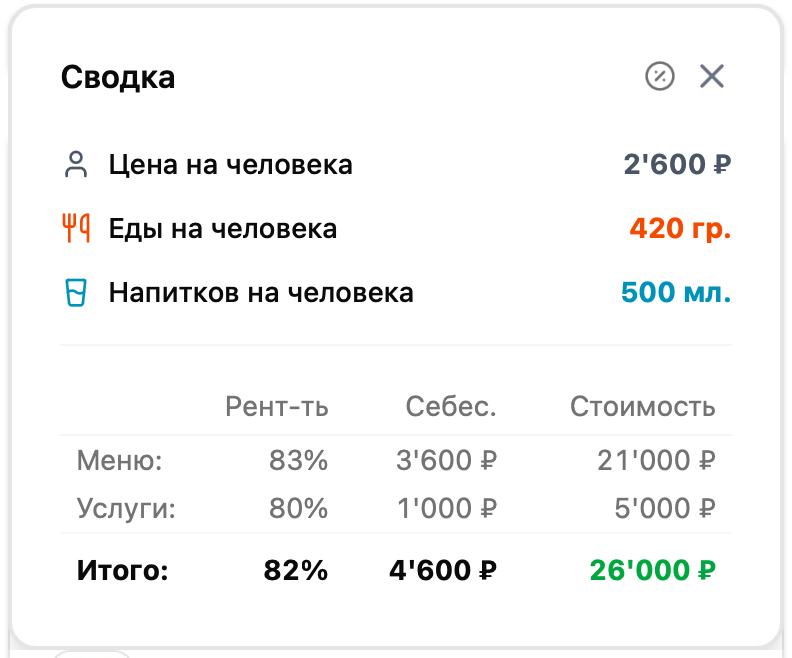 - Гостей — количество гостей. Если указано, при составлении сметы и в КП будут рассчитываться выходы еды и напитков на человека