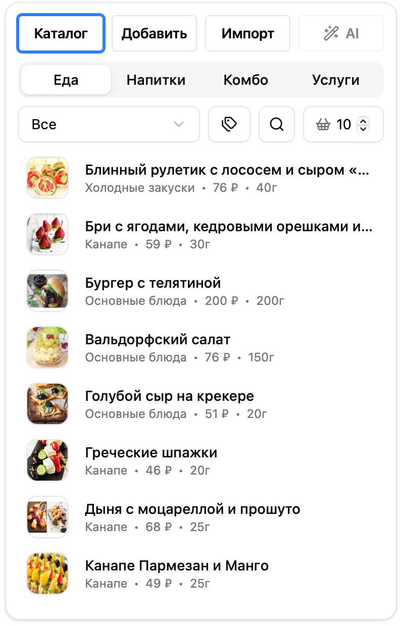 Вверху можно выбрать категорию (еда, напитки, комбо, услуги), ниже - подкатегорию или теги для фильтрации, а также можно найти нужную позицию по названию.