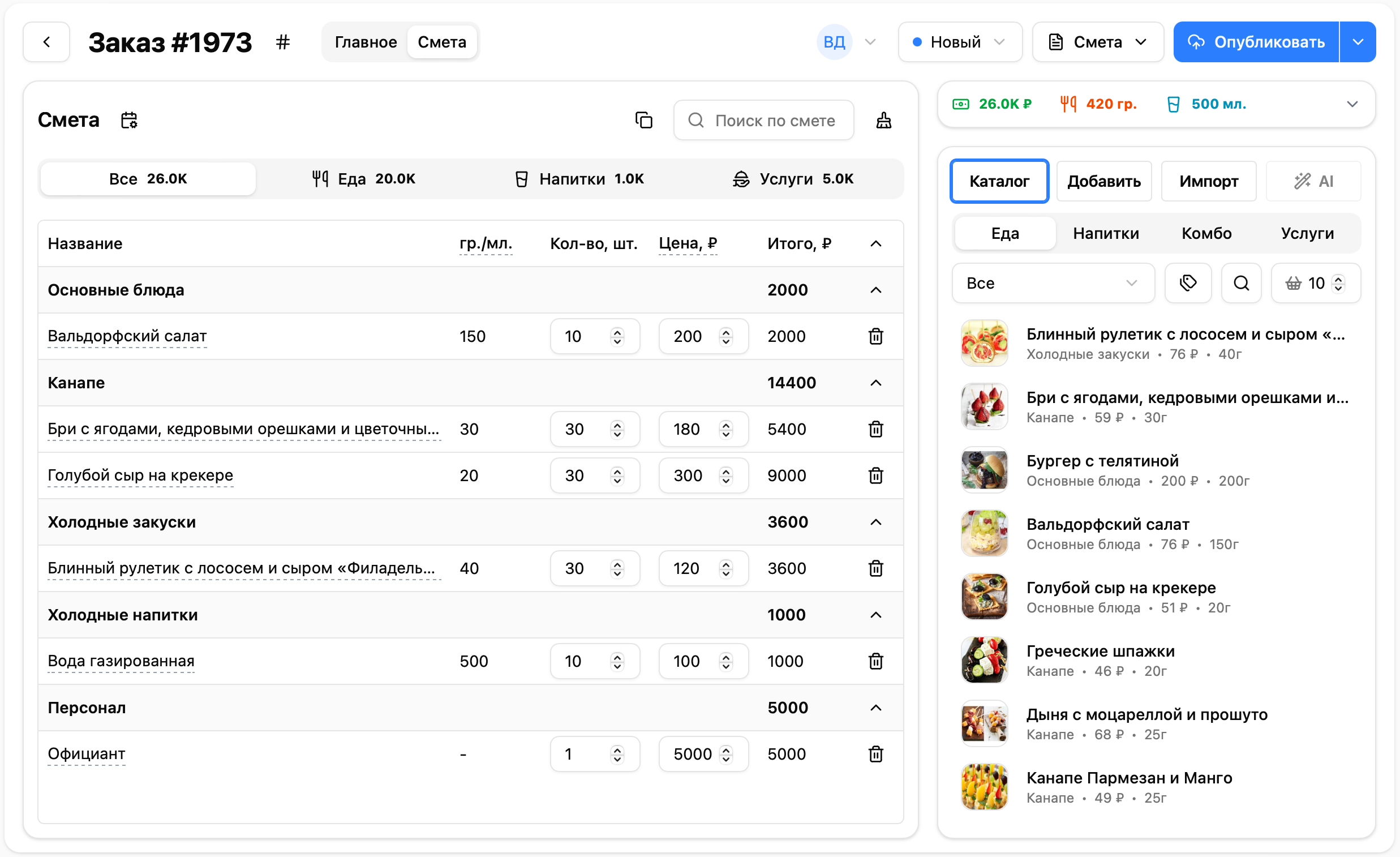 - Кнопки фильтрации по категориям — Все / Еда / Напитки / Услуги / Бонусы для быстрой фильтрации позиций в смете. На вкладке отображается сумма по каждой категории.