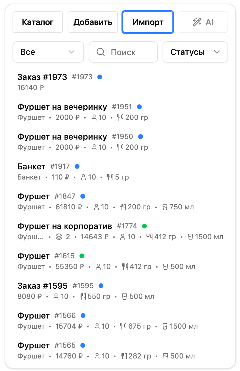Важно: при импорте из заказа, состоящего из нескольких приемов пищи, все позиции из всех приемов пищи будут добавлены в текущий прием пиши.